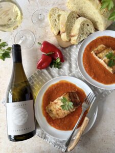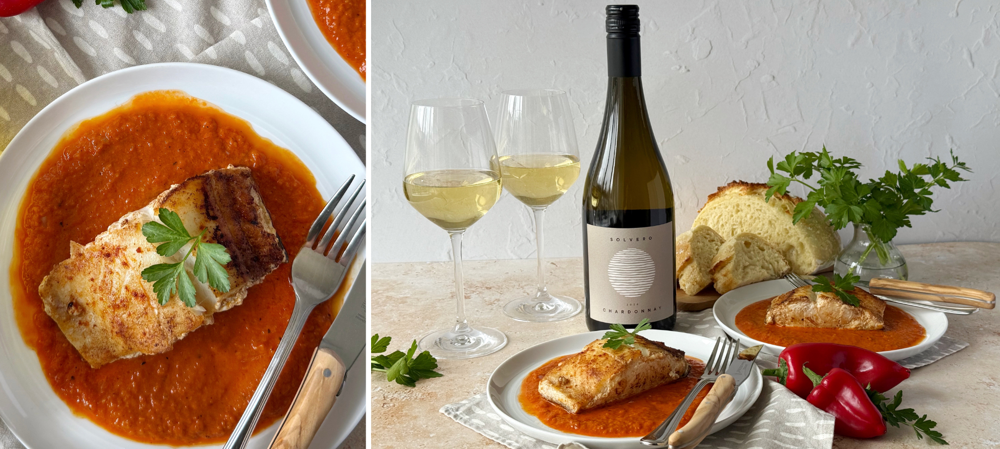 The Solvero 2024 Chardonnay brings the pairing into focus. Round and mouth-filling with balanced acidity, it offers notes of pear, apricot and peach layered with hazelnut, minerality and a subtle brioche character. Barrel fermented and aged for 11 months, the wine’s creamy texture complements the buttery lingcod, while its freshness lifts the sweetness of the roasted red peppers, creating a harmonious and expressive finish.